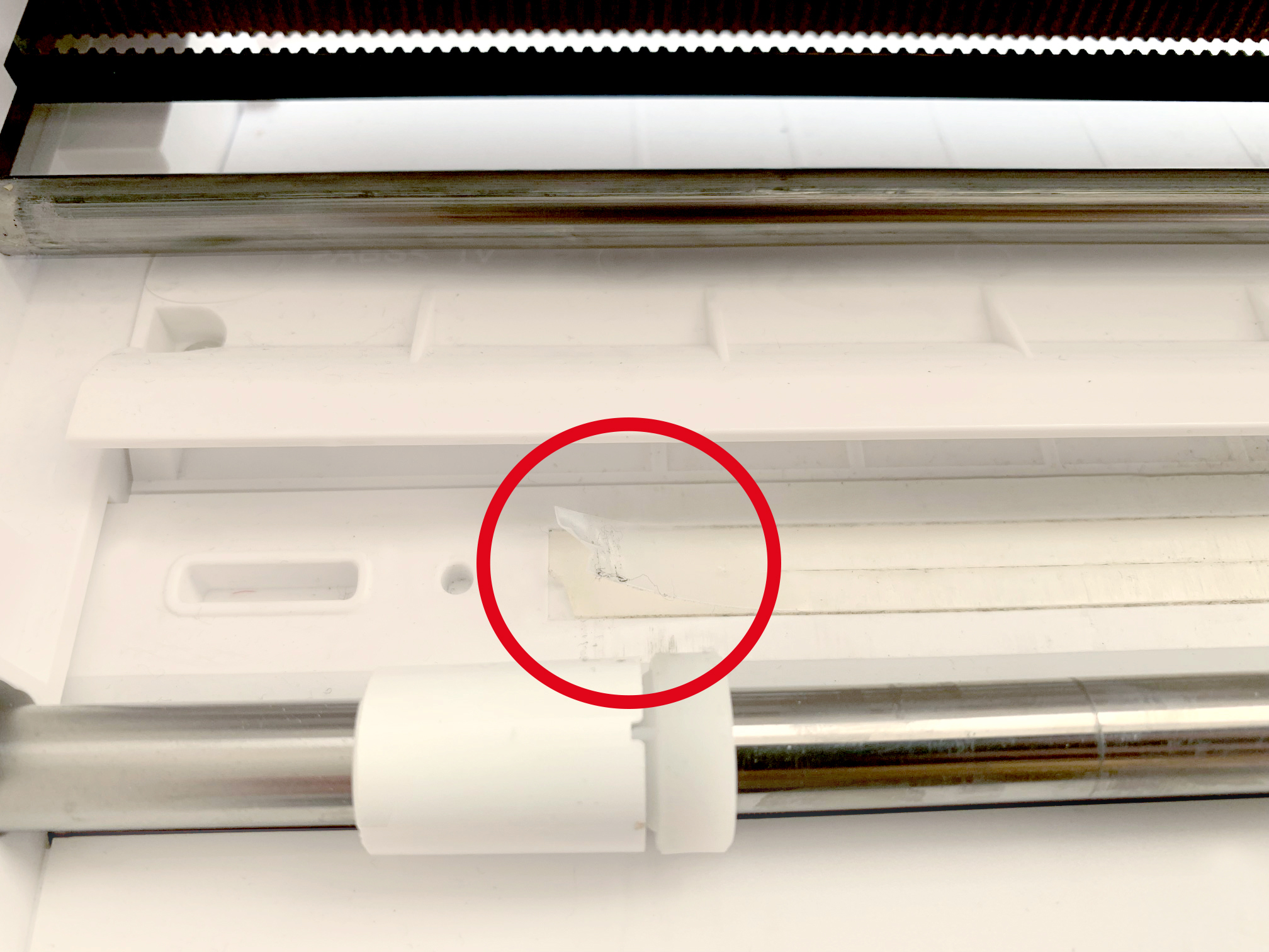 Meist ist das Problem eine kaputte Schneideleiste. Du erkennst sie daran, dass ein Schnitt durch die Mitte der Leiste hindurch geht, meist sammeln sich darin schon Fussel, da die Leiste eine klebrige Unterseite hat. Wenn deine Schneideleiste aussieht wie auf dem Bild, dann solltest du sie dringend auswechseln.