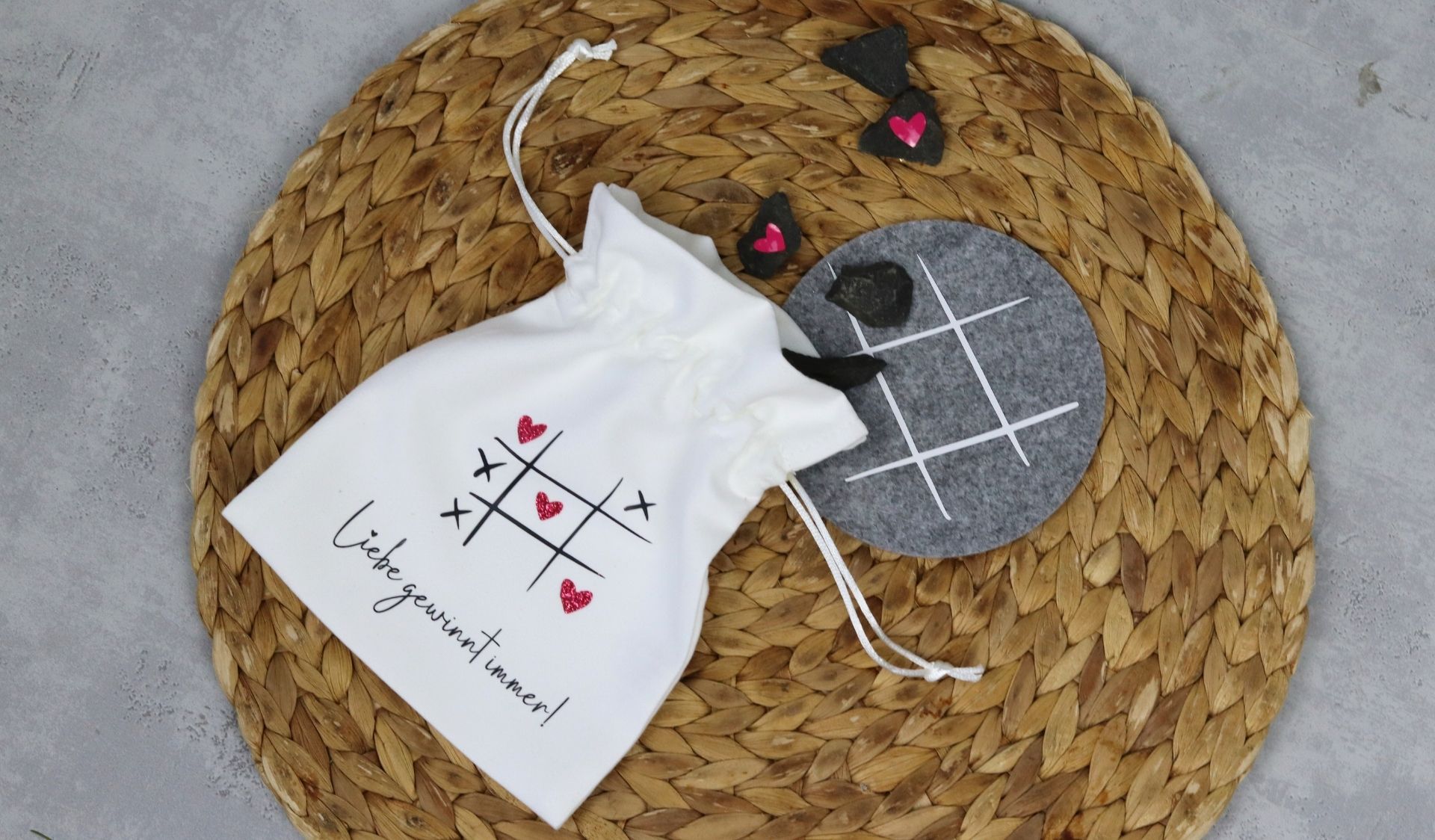 Die entgitterten Herzchen kannst Du mithilfe einer Übertragungsfolie auf 5 Deiner Spielsteine kleben. Sind es Steine von draußen, solltest Du sie vorab reinigen, damit die Folie sich nicht direkt wieder löst.